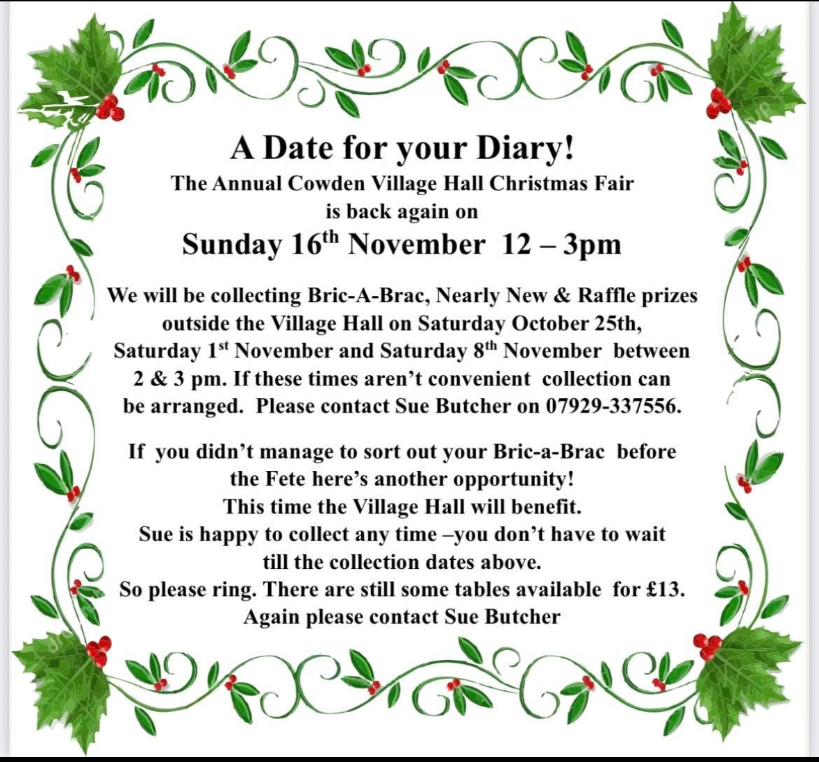 Christmas Fair – save the date – 16 November Posted on August 22, 2025August 22, 2025 by cowdenvillagehall
