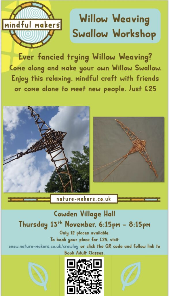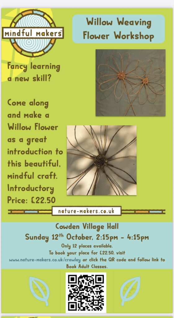 Fancy trying your hand at willow weaving? Mindful makers are running two workshops in the hall: Sunday 12 October and Thursday 13 November. See posters below for details: